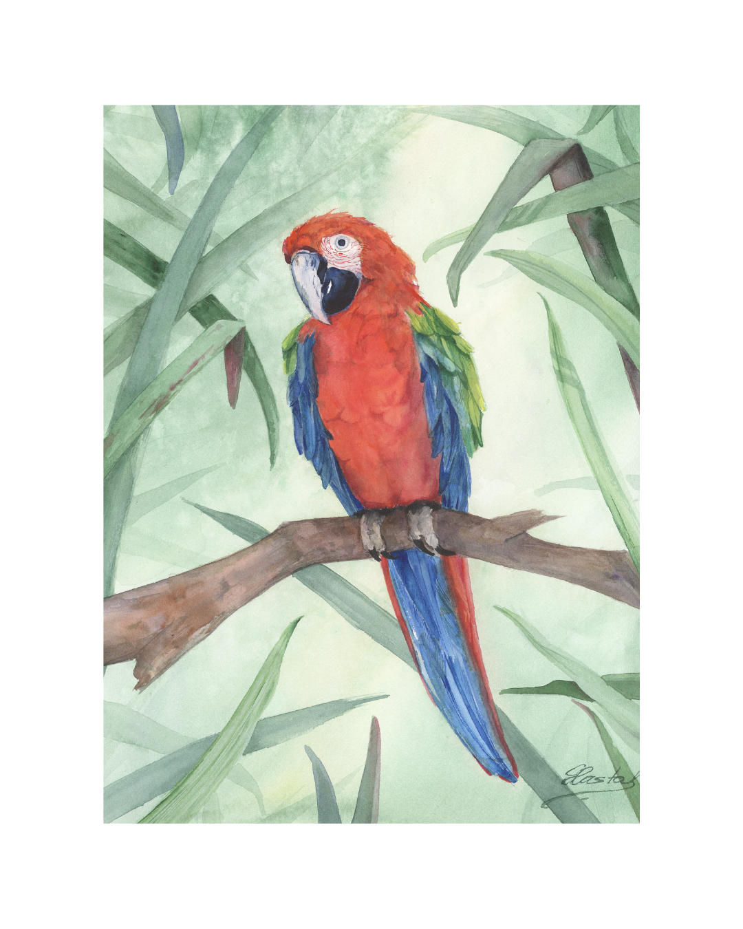 Original watercolor of a scarlet macaw in soft tropical greenery.